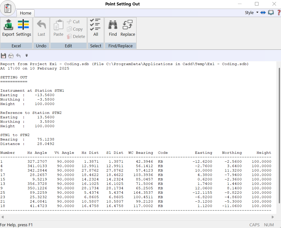 A Setting Out report will be created in the report view for the current model (image below). This can be copied and pasted into another application, saved to a text file for later retrieval or printed so that a hard copy can be taken on-site.