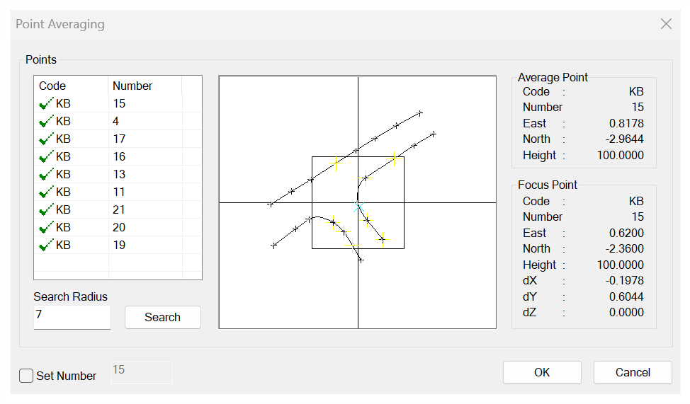 When OK is selected, all points marked with a green tick are deleted and replaced by a single point at the calculated average coordinates. This new point retains the attributes of the initially selected point, including its point number, unless the Set Number checkbox is enabled. When selected, this option allows a new point number to be entered in the adjacent field.