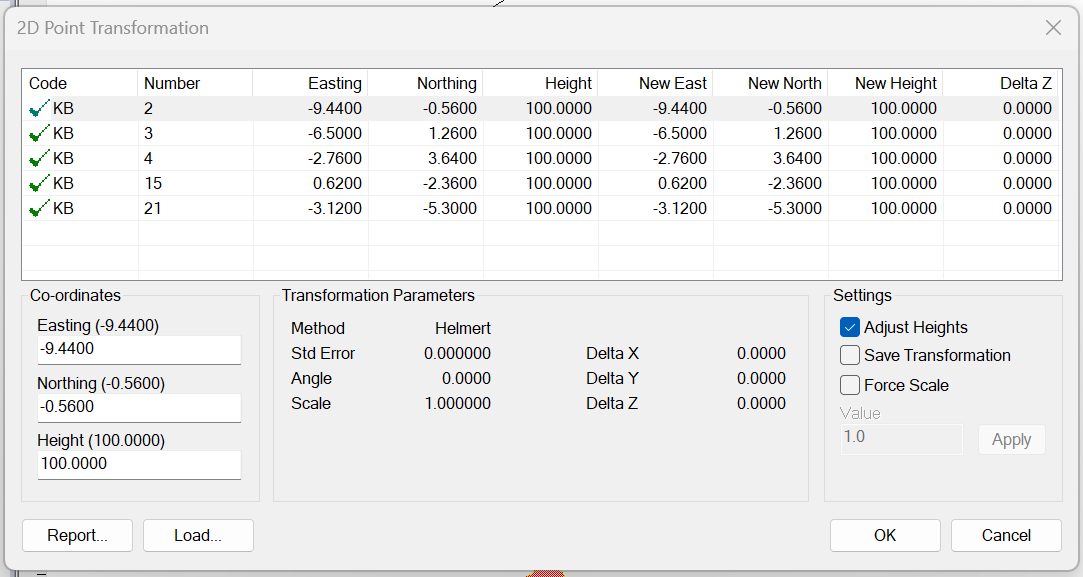 2D - This function allows you to transform points to another coordinate system, and this is done by selecting a minimum of two points and right-clicking the mouse. A dialog box like the one shown below will appear and then you can start inputting new coordinate values for each point you have selected. The transformation can be saved and loaded at a later time using the Save Transformation button at the bottom right of the box. Additionally, you can scale the points by using the Force Scale button and manually inputting the required scale value.
