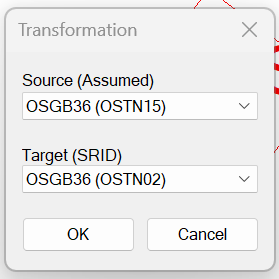 OSGB36: This function allows you to transform all the point coordinates in the current model between the OSTN02 and OSTN15 transformation. When selected, the dialog box seen below will be displayed. The current system field informs you which transformation model is currently in use and can display one of three values.