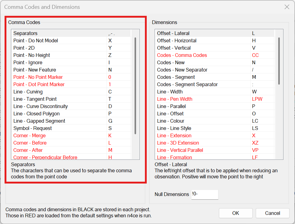 Comma codes are referred to as such because the comma is what n4ce uses to separate the comma codes from the main part of the code string. However, on some survey instruments and data loggers, it can take a few key presses to produce a comma character. The Separators field allows you to specify one or more alternative characters that can be used. When survey information is imported, the existence of any one of the specified characters will allow n4ce to recognise comma codes. When n4ce displays comma codes, it always uses a comma character.